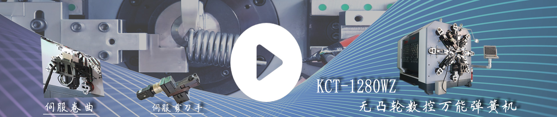 【彈簧機視頻】KCT-1245WZ 十二軸無凸輪數控萬能彈簧轉線成形機,采用臺灣電腦數控系統和日本安川伺服電機,獨特的無凸輪和無搖臂設計,刀架由八組伺服馬達獨立控制,其中包括刀架八軸、送線軸、轉芯軸、轉線軸和卷曲軸。1245WZ型彈簧機統成由曲柄連桿成形系統、送線和轉線系統、繞線校直系統及轉芯系統等組成。本機可配帶液壓剪刀裝置,成形切割噪音小,對芯棒及機器的損害為零。適合于生產各種拉簧、扭簧、壓簧、渦卷簧、塔形簧、扁線簧等高難度的異形彈簧。此機極大的增加了彈簧加式范圍,成形精密準確,調機方便快速,生產穩定。