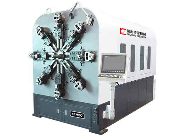開創KCT-1260WZ十二軸無凸輪數控萬能彈簧轉線成形機利用臺灣Windows7操作控制系統、引用日本進口安川伺服電機,采用獨特的無凸輪和無搖臂設計,刀架由八組伺服馬達獨立控制,其中刀架八軸、送線一軸、轉芯一軸、轉線一軸和卷曲一軸,其統成由曲柄連桿成形系統、送線系統、轉線系統、校直系統和轉芯系統等組成。此外,該機型可配帶液壓剪刀裝置,切割噪音小,對芯棒及機器的損害為零;同時也極大的提升了彈簧加工范圍,不僅具有成形快、精度準和性能穩等特點,而且調機更方便,易操作。